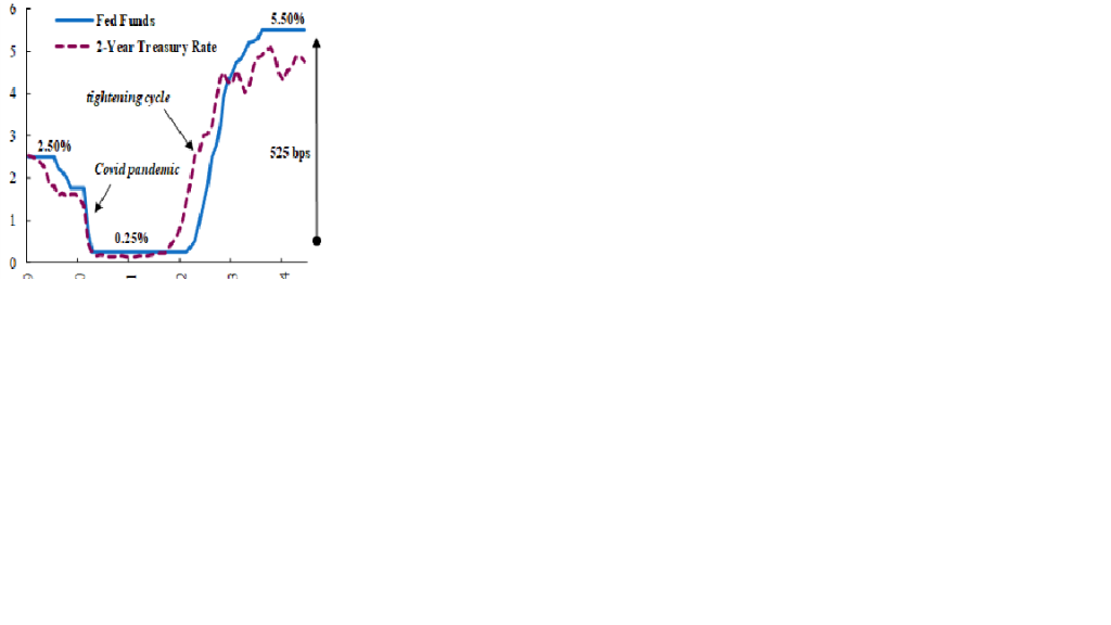 Mais les conditions ont changé de manière significative tout au long de l’année, trois mois consécutifs d’inflation élevée ayant alimenté les inquiétudes concernant la trajectoire de désinflation. Cette situation, associée à des prévisions de croissance plus élevées, a entraîné une réévaluation significative des taux d’intérêt à court terme, qui devaient alors rester « plus élevés pendant beaucoup plus longtemps ». Certains analystes et investisseurs ont même envisagé la possibilité de nouvelles hausses de taux afin d’éviter une ré-accélération durable de l’inflation.