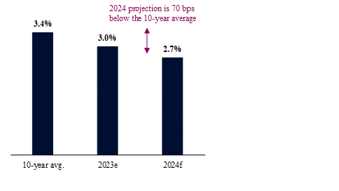 Par conséquent, cette année, les analystes sont plus prudents dans leurs prévisions. Les prévisions consensuelles de Bloomberg indiquent actuellement une expansion faible, mais toujours positive, de 2,7 % en 2024. Cela implique une modération par rapport à l’année dernière, maintenant la croissance mondiale nettement en dessous de la moyenne à long terme de 3,4 %.