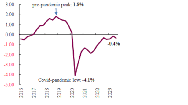 Par ailleurs, en dépit d’une reprise notable depuis le creux de la vague observé lors de la pandémie de Covid, la demande globale demeure inférieure à la capacité de production à long terme de l’économie. La Banque du Japon utilise les données relatives au capital et au travail afin d’élaborer la statistique de « l’écart de production », qui mesure le niveau de la demande par rapport aux possibilités de production de l’économie. Cette mesure est suivie de près par la BoJ, étant donné que des écarts de production négatifs persistants mettent en garde contre des pressions déflationnistes potentielles. Durant la pandémie de Covid, l’écart de production s’est effondré à -4,1 %, annonçant la chute de l’inflation en zone négative. Après 14 trimestres consécutifs dans la zone négative, la demande ne s’était pas encore totalement rétablie à la date de la dernière publication du T3-2023, où elle était encore inférieure à la capacité de production de 0,4 %. Le tremblement de terre qui a frappé le Japon  le jour de l’an a renforcé les inquiétudes, alors que les indicateurs avancés pointent vers un nouveau ralentissement de l’activité économique. Ainsi, les perspectives globales de croissance économique du Japon demeurent sombres, fournissant à la BoJ un argument supplémentaire pour différer un changement de taux d’intérêt directeur.