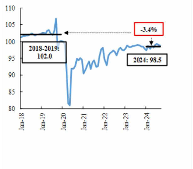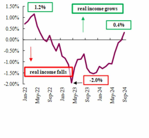 Premièrement, la croissance robuste des salaires devrait surpasser l’inflation, augmentant ainsi le revenu réel et favorisant une reprise de la consommation. L’inflation élevée des deux dernières années a érodé le pouvoir d’achat des ménages, entraînant une stagnation de la consommation, restée bien en deçà des niveaux moyens d’avant la pandémie (2018-2019).