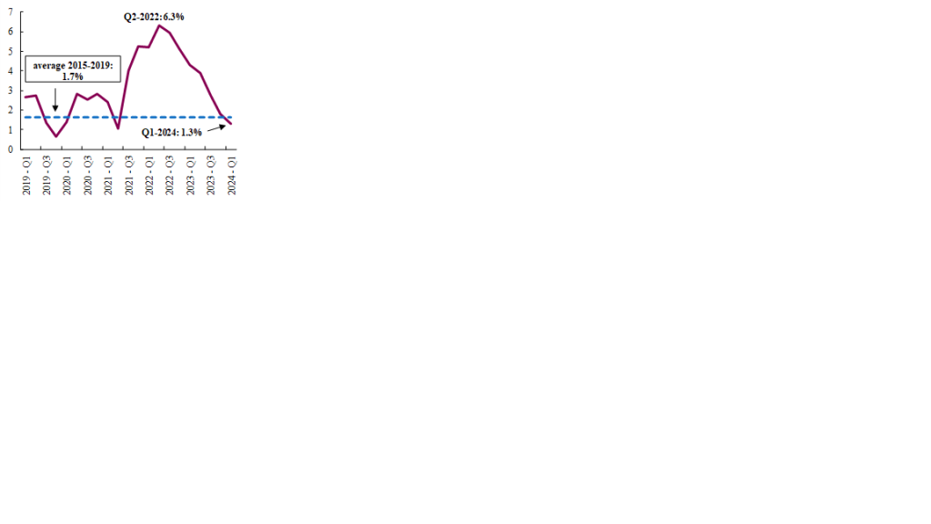 Au cours des trois trimestres se terminant au premier trimestre 2024, la production horaire dans le secteur des entreprises non agricoles a augmenté à un taux moyen de 2,7 % en glissement annuel, dépassant de loin la croissance de la productivité dans d’autres économies avancées. Grâce à la forte croissance de la productivité, les coûts unitaires de la main-d’œuvre ont continué à baisser sensiblement depuis le pic de 6,3 % atteint au deuxième trimestre 2022, pour revenir à la moyenne inférieure à 2 % enregistrée avant la pandémie de Covid entre 2015 et 2019, ce qui a contribué à la modération de l’inflation.