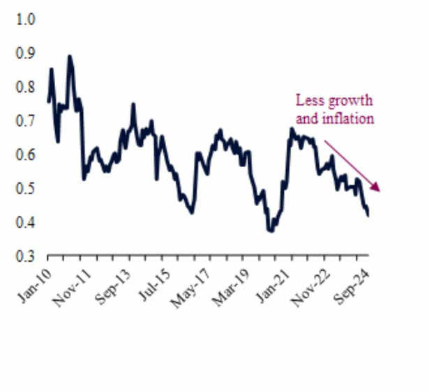 Deuxièmement, le ratio cuivre/or, indicateur traditionnel des attentes de croissance, d’inflation et du sentiment de risque, semble pointer vers un environnement modéré dans les trimestres à venir. Cela contraste avec l’idée que « Trump 2.0 » pourrait augmenter à la fois le PIB potentiel et l’inflation, provoquant un fort comportement « risk-on » chez les investisseurs. Si cela était le cas, les prix du cuivre auraient augmenté à un rythme plus rapide que ceux de l’or, entraînant une hausse du ratio cuivre/or. Or, c’est le contraire qui se produit, ce qui suggère, si l’on se limite aux dynamiques des marchés des matières premières, des perspectives de pression inflationniste réduite et de croissance modérée.