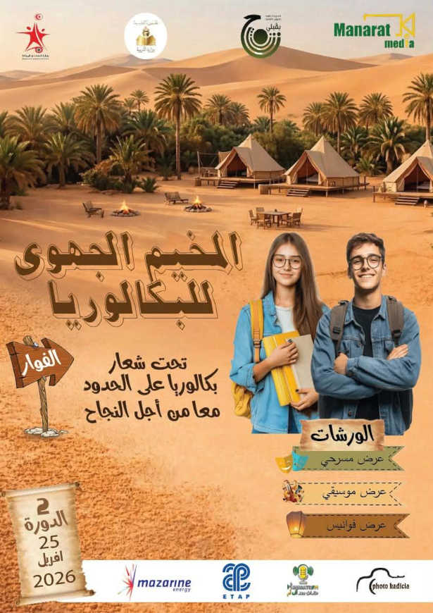 Les travaux de la deuxième session du camp régional du baccalauréat se sont achevés dans la délégation d’El Faouar, relevant du gouvernorat de Kébili. Ce camp a été organisé par l’Association Manarat pour les médias audiovisuels, en partenariat avec le Commissariat régional à l’éducation, le Commissariat régional aux affaires culturelles et le Commissariat régional à la jeunesse et aux sports, avec le soutien de l’Entreprise tunisienne des activités pétrolières et de la société « Mazarine Energy », sous le slogan : « Baccalauréat aux frontières, ensemble pour la réussite ».