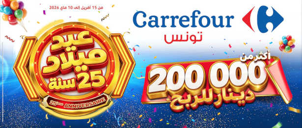 À l’occasion du 25ᵉ anniversaire de ses hypermarchés, Carrefour Tunisie organise une opération exceptionnelle du 15 avril au 10 mai 2026 dans ses magasins Carrefour La Marsa, Carrefour Mall of Sousse et Carrefour Mall of Sfax.
