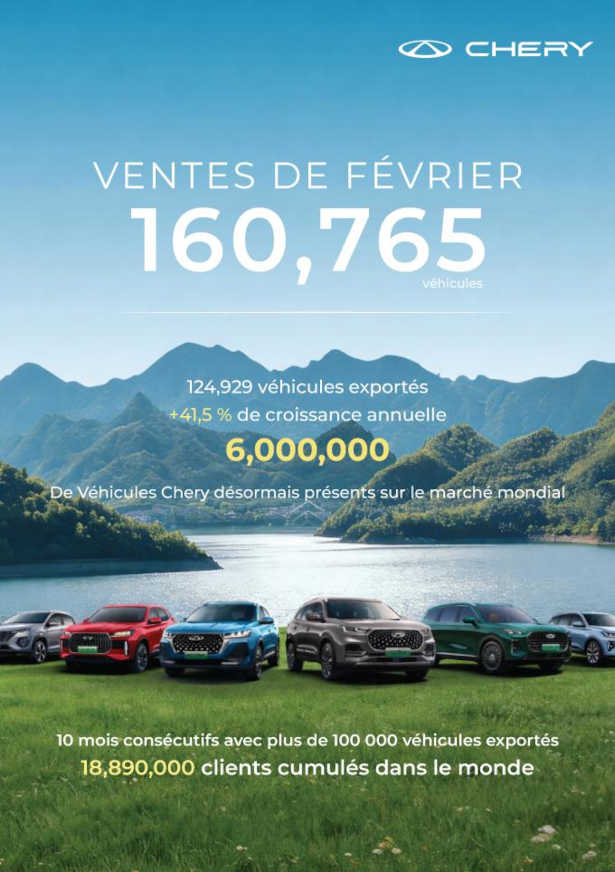 Chery poursuit son expansion internationale avec des performances remarquables en février 2026. Le constructeur a enregistré 160 765 véhicules vendus sur les deux premiers mois de l’année 2026, soit une hausse de 41,5 % par rapport à la même période l’année dernière.