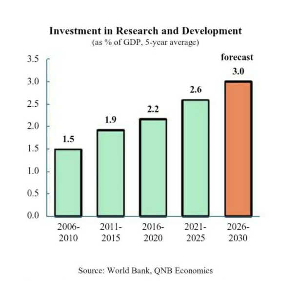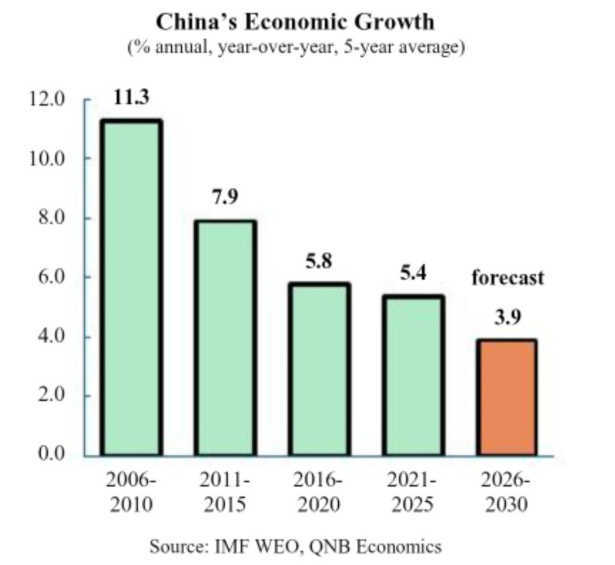 At the core of the 15th FYP’s industrial strategy lies a fundamental guidance: digital economy value- added growth, with some estimates suggesting levels of 12.5% of GDP by 2030. Beijing is no longer counting how many chips are produced, but measuring how deeply computing infrastructure, artificial intelligence (AI), and digital platforms penetrate the broader economy. A flagship “AI Plus” programme aims to embed artificial intelligence across industries as a productivity driver. Beyond semiconductors, the plan targets breakthroughs in biotechnology, quantum computing, advanced materials, aerospace, and 6G communications. Traditional industries — metals, machinery, and textiles — are to be upgraded through automation and digitalisation rather than replaced. This reflects a maturing policy approach of building an economy that produces and integrates advanced technology. A key priority of the 15th FYP is its emphasis on household consumption as a driver of domestic demand. While investment, infrastructure, and exports remain important pillars of the Chinese economy, the plan places greater weight on expanding the role of private consumption in sustaining growth. Concretely, this means expanding childcare support to reduce the financial burden on young families, broadening pension coverage to give older households the confidence to spend rather than save, and improving employment conditions to support income growth across the working-age population. Reducing the savings rate is central to this strategy and redirects resources toward sectors that boost domestic demand.