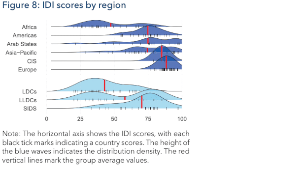 Le rapport souligne également que 20 pays africains sur les 45 étudiés affichent un score supérieur à 50 points, ce qui dénote des progrès sensibles dans le développement des TIC. Beaucoup reste cependant à faire, car huit des dix pays du monde affichant des scores inférieurs à 30 points se trouvent en Afrique.