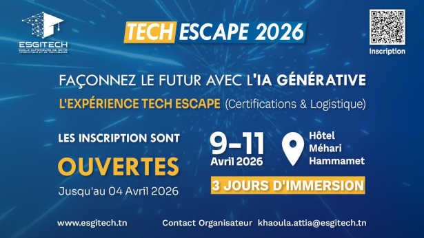 ESGITECH, la première université privée exclusivement spécialisée en informatique en Tunisie, annonce le lancement de « Tech Escape 2026 », un événement inédit combinant immersion technologique et hackathon intensif autour de l’intelligence artificielle générative. Prévu du 9 au 11 avril 2026 à Hammamet, cet événement réunira étudiants, passionnés de tech et futurs innovateurs autour d’un défi : imaginer et construire les solutions digitales de demain.