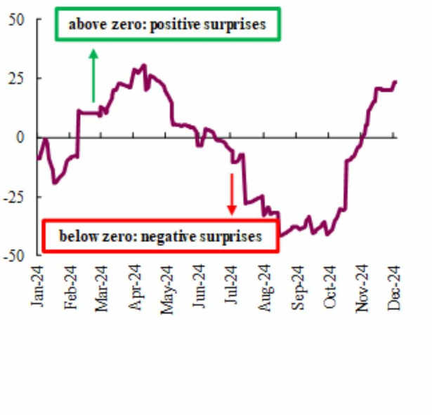 Premier facteur : Les indicateurs économiques enregistrent des surprises positives, avec des signaux indiquant que l’élan constructif persistera. L’Indice de Surprises Économiques est confortablement passé dans la zone positive au Q4-2024, grâce à de meilleurs indicateurs que prévu dans les principaux secteurs de production. Les marchés immobiliers ont montré des signes de stabilisation, les baisses des prix et des ventes ayant ralenti, certains indicateurs affichant même une croissance positive. Cela fait suite à l’augmentation des incitations dans le secteur, notamment la relaxation des conditions sur les hypothèques et l’annonce de fonds pour des projets ciblés et des logements pour les familles à revenu faible.