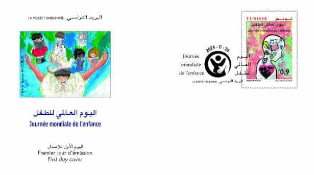 A cette occasion, la Poste Tunisienne émet le 20 novembre 2024, en partenariat avec le Ministère de la Famille, de la Femme, de l’Enfance et des Personnes âgées et le Ministère de l’Education, un timbre-poste conçu et dessiné dans le cadre de la manifestation « Philakids » par un groupe d’élèves des collèges.