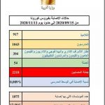 Le ministère de l’Education a annoncé dans un communiqué publié hier jeudi 12 novembre 2020, que 2218 cas de contamination au coronavirus ont été enregistrés du 15 septembre au 11 novembre en milieu scolaire, dont 917 parmi les élèves, 1043 parmi les enseignants, 204 parmi le cadre pédagogique, administratif et les surveillants et 54 parmi les ouvriers.