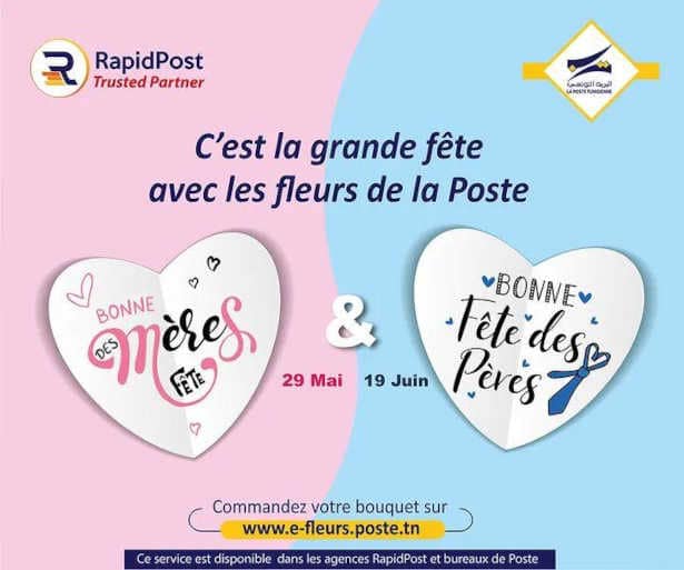 Dans un communiqué rendu public , la Poste Tunisienne annonce qu’à l’occasion de la célébration de la fête des mères, RapidPost assure une séance de travail le dimanche 29 mai 2022 afin de livrer les bouquets de fleurs commandés auprès des Agences RapidPost et à distance via le site www.e-fleurs.poste.tn.