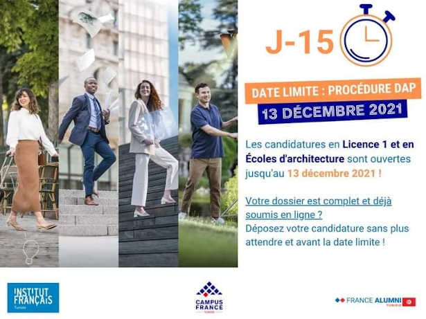 Campus France a annoncé que le 13 décembre 2021 est la date butoir pour le dépôt des candidatures de la procédure DAP (Demande d’admission préalable en Licence 1 et en Ecoles d’architecture), celle-ci concerne tout étudiant tunisien ou étranger résidant en Tunisie, désireux de poursuivre ses études supérieures en France en :