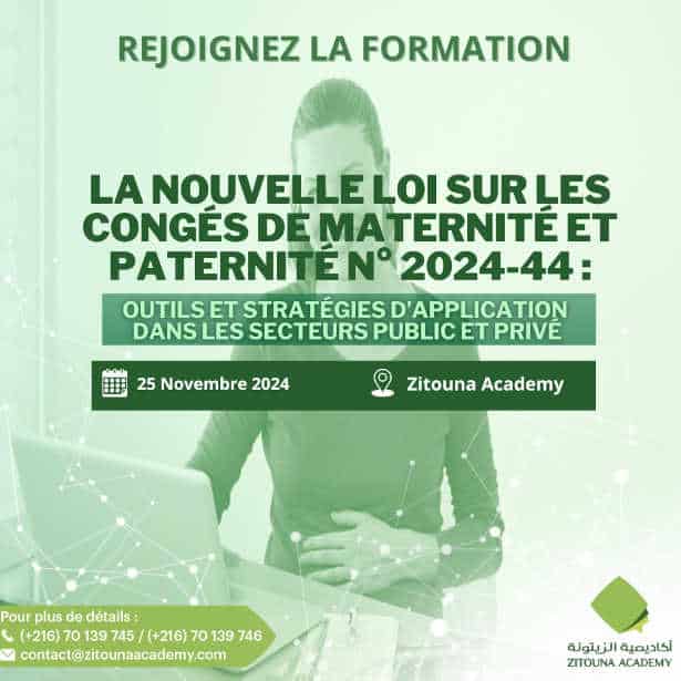 Zitouna Academy organise le 25 novembre 2024, une formation sur la Nouvelle Loi sur les Congés de Maternité et Paternité N°2024-44 : Outils et Stratégies d’Application dans les Secteurs Public et Privé