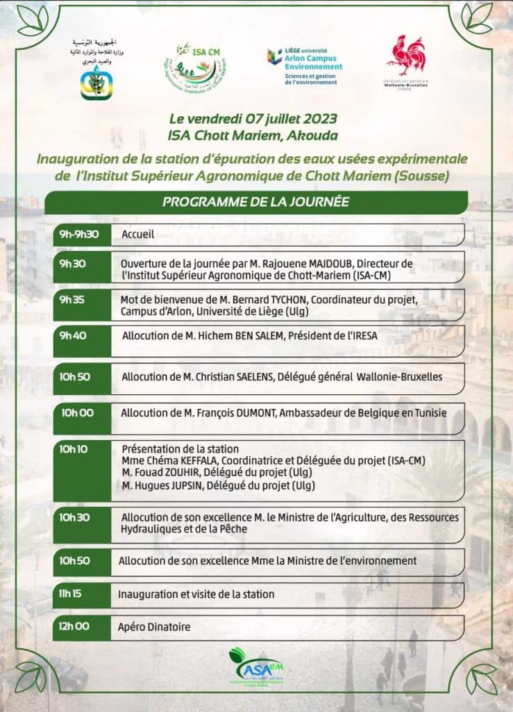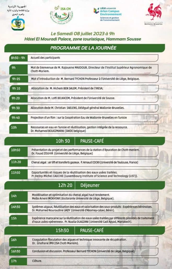Sous le haut patronage de Monsieur Moneem Bel Ati, Ministre de l’Agriculture, des Ressources Hydrauliques et de la Pêche , l’Institut Supérieur Agronomique de Chott Mariem (Sousse) et l’Université de Liège (Belgique), avec l’appui de Wallonie-Bruxelles International, organisent vendredi 07 juillet l’inauguration de la station d’épuration des eaux usées expérimentale de l’ISA et un colloque international intitulé : « Les Micro-Algues comme alternative durable pour le traitement des eaux usées vers des techniques d’épuration » samedi 08 juillet 2023.