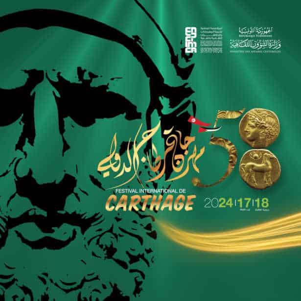 Il est à noter que l’affiche de la 58ème édition du Festival international de Carthage, récemment dévoilée sur sa page Facebook, met en avant les traits d’Hannibal sur un fond vert, où deux pièces de monnaie ancienne forment le chiffre 8. Cette illustration symbolise l’histoire riche et glorieuse que représente Hannibal pour Carthage, ainsi que la solidarité de la Tunisie et du Festival avec la cause palestinienne, avec la présence des drapeaux tunisien et palestinien.