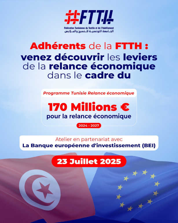 La FTTH, en partenariat avec la Banque Européenne d’Investissement et la Délégation de l’Union Européenne en Tunisie, organise un atelier dédié au programme « Tunisie Relance Économique », le 23 juillet 2025. Une initiative phare pour soutenir le financement et la relance durable des PME tunisiennes.