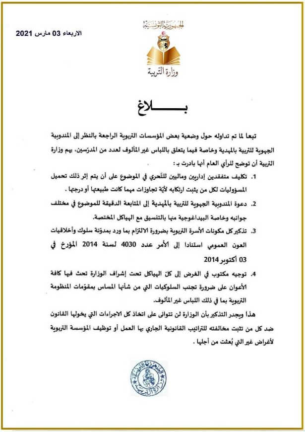 Dans un communiqué rendu public dans la soirée de mercredi 3 mars 2021 , le ministère de l’Éducation a annoncé l’ouverture d’une enquête répondant ainsi aux sollicitations de la Ligue tunisienne des droits de l’homme (LTDH) au sujet des pratiques anticonstitutionnelles de quelques enseignants dans deux écoles publiques à Chobrane dans le gouvernorat de Mahdia.