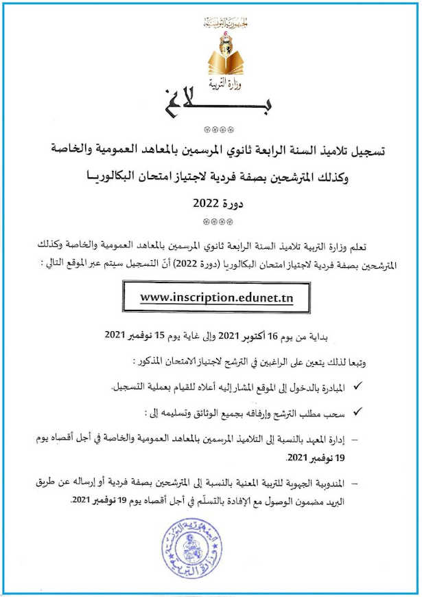 L’inscription des élèves de la 4ème année secondaire (baccalauréat) des écoles publiques et privées, ainsi que des candidats libres, session 2022 se fera via le site www.inscription.edunet.tn, et s’étalera du 16 octobre au 15 novembre 2021.