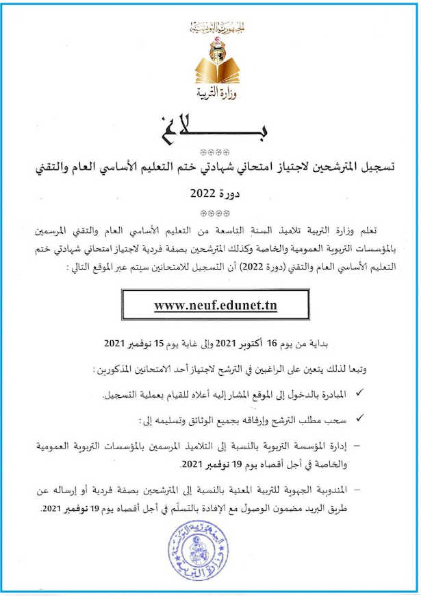Les candidats de la 9ème année devront eux s’inscrire sur le site www.neuf.edunet.tn, au cours de la même période, et selon les mêmes modalités.