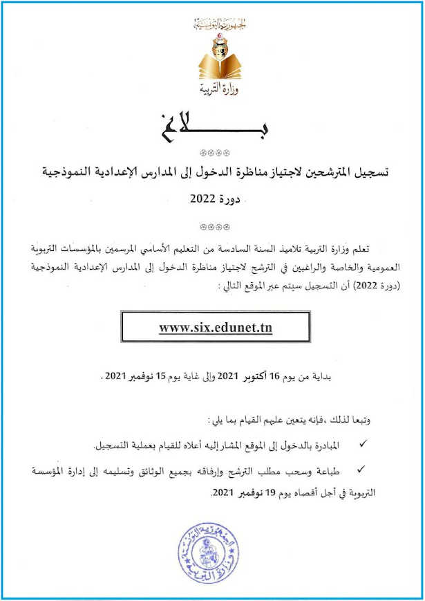 Les élèves souhaitant participer au concours d’entrée aux collèges pilotes (sixième), devront s’inscrire via le site www.six.edunet.tn.
