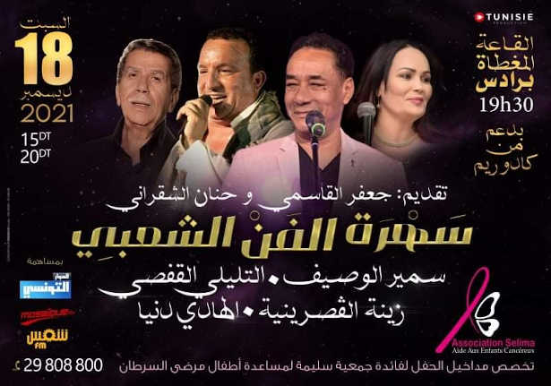 Une soirée de solidarité sera organisée, le samedi 18 décembre 2021, à la salle couverte de Radès soutenue par K2rhym avec la participation des chanteurs Samir Loussif , Hedi Donya , Zina Kasrineya et Tlili Gafssi.