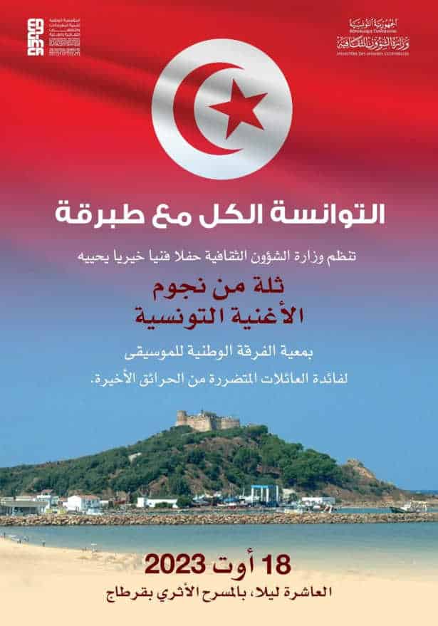 A l’initiative du Ministère des Affaires Culturelles, la Fondation Nationale pour le Développement des Festivals et Evénements Culturels et Artistiques, en partenariat avec l’instance dirigeante du 57ème édition du festival International de Carthage, organise un concert caritatif interprété par un groupe de stars de la chanson tunisienne avec la troupe Nationale de Musique dirigée par le Maestro Youssef Belhani, le vendredi 18 août 2023 au Théâtre Archéologique de Carthage.