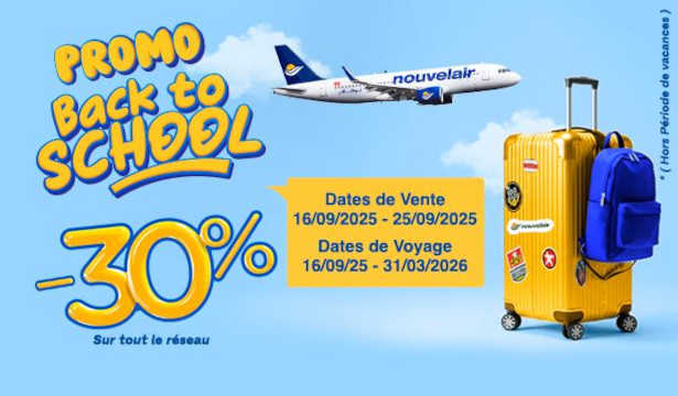 À l’occasion de la rentrée, nouvelair réitère son rendez-vous habituel avec ses clients et lance une promotion exceptionnelle de 30% de réduction sur l’ensemble de son réseau.