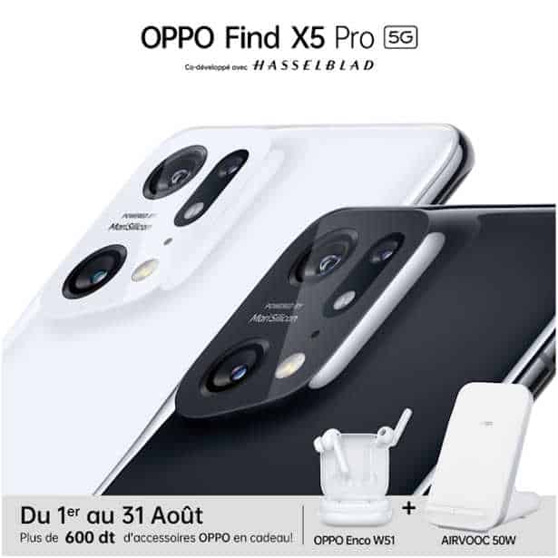 L’OPPO Find X5 Pro sera disponible, en Tunisie, à partir du 1er août 2022 au prix de 4 999 dinars, avec une offre spéciale durant tout le moisd’août incluant gratuitement le chargeur sans fil AIRVOOC 50W et les écouteurs premium OPPO ENCO W51.