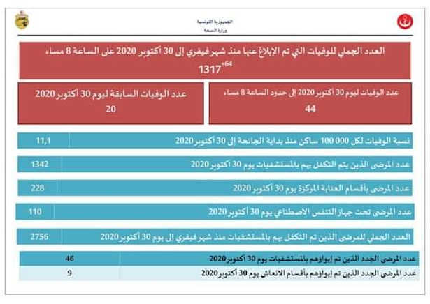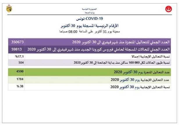 Dans son bilan publié, le vendredi 30 octobre 2020, le ministère de la santé a annoncé que 1.784 nouveaux cas ont été testés porteurs du virus sur les 4590 tests effectués en 24 heures.