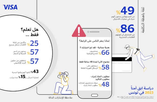 Selon la dernière étude ‘Stay Secure’ de Visa, l’excès de confiance expose les consommateurs tunisiens à être victimes de fraudes. Bien que près de la moitié des personnes interrogées (49%) affirment être suffisamment averties pour éviter les escroqueries en ligne et par téléphone, la réalité est que huit personnes sur dix (86%) sont susceptibles de ne pas tenir compte des signes d’alerte qui suggèrent une activité criminelle en ligne.