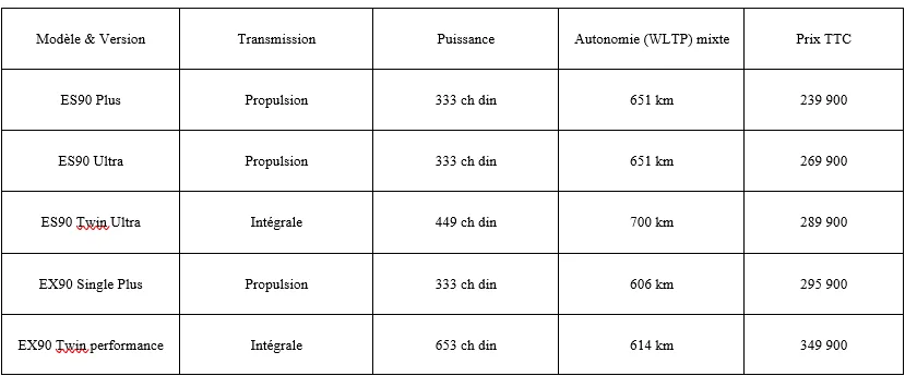 Le nouveau Volvo ES90 100 % électrique combine l’élégance d’une berline, l’adaptabilité d’un fastback et l’espace d’un SUV, offrant polyvalence, confort et sécurité sans compromis. Construit sur la nouvelle architecture SPA2 et équipé de technologie 800V, il propose une autonomie record allant jusqu’à 700 km d’autonomie (WLTP) et une recharge ultra-rapide de 300 km en 10 minutes. Son design scandinave futuriste couplé avec la fameuse signature lumineuse Volvo en marteau de Thor et un intérieur luxueux, minimaliste combinant à la perfection boiserie, cuivre, aluminium et technologie donnant l’impression d’être dans un magnifique tableau suédois, avec un coffre modulable jusqu’à 733 litres et un toit panoramique électrochrome. Ce dernier intègre également un système audio Bowers & Wilkins Dolby Atmos, un infodivertissement Google dernière génération et des technologies de conduite assistée avancées.