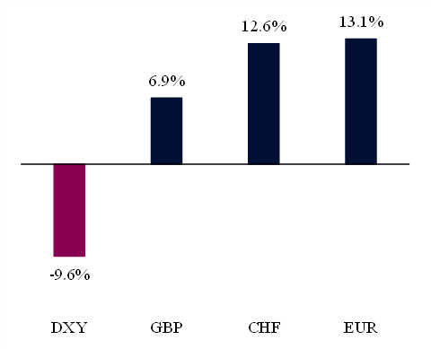 Foreign exchange (FX) markets are the clearest expressions of global macro trends, being at the centre of capital flows and the allocation decisions behind them. Last year, major FX markets have presented significant volatility. The USD Index (DXY), a traditional benchmark that measures the value of the USD against a weighted basket of six major currencies, has experienced an 9.6% depreciation in 2025, one of the worst performances for the greenback in almost a decade. In contrast, the Euro (EUR), the Swiss Franc (CHF) and the Pound Sterling (GBP) appreciated markedly against the USD.