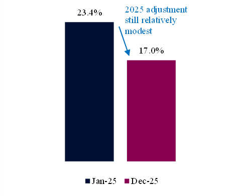 First, despite the significant depreciation in 2025, the USD still remains “overvalued” according to some standard metrics, suggesting the need for more long-term adjustments. A common way to look at currency “valuations” is to analyse trade-weighted, inflation-adjusted exchange rates, i.e., the real effective exchange rates (REER), and compare it to their own long-term averages or historical norms. This REER metric is more robust than traditional FX rates as it captures changes in trade patterns between countries as well as economic imbalances in the form of inflation and inflation differentials. The REER picture for December 2025 suggests that the USD is indeed the most overvalued currency in the advanced world, by more than 17% of its notional “fair value.” Importantly, while the USD depreciation last year was significant, it accounted for only a modest adjustment of USD overvaluation. In fact, from peak USD strength in January 2025, the overvaluation had only declined by 640 basis points or less than 30% of the value needed for a full adjustment. A higher US inflation than what is observed in important US trade partners in Asia and Europe also make a full adjustment more difficult. In other words, structurally, both due to accumulated imbalances and higher relative inflation, the USD is expected to remain under pressure.